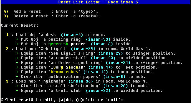 The third argument depends on the reset type and will be either a mob id, an object id or the number of exits in the room to randomize. If you enter the full reset, it will just be added to the list. If you enter only 'a [type]' you will be taken into the detail screen for that reset to complete it.